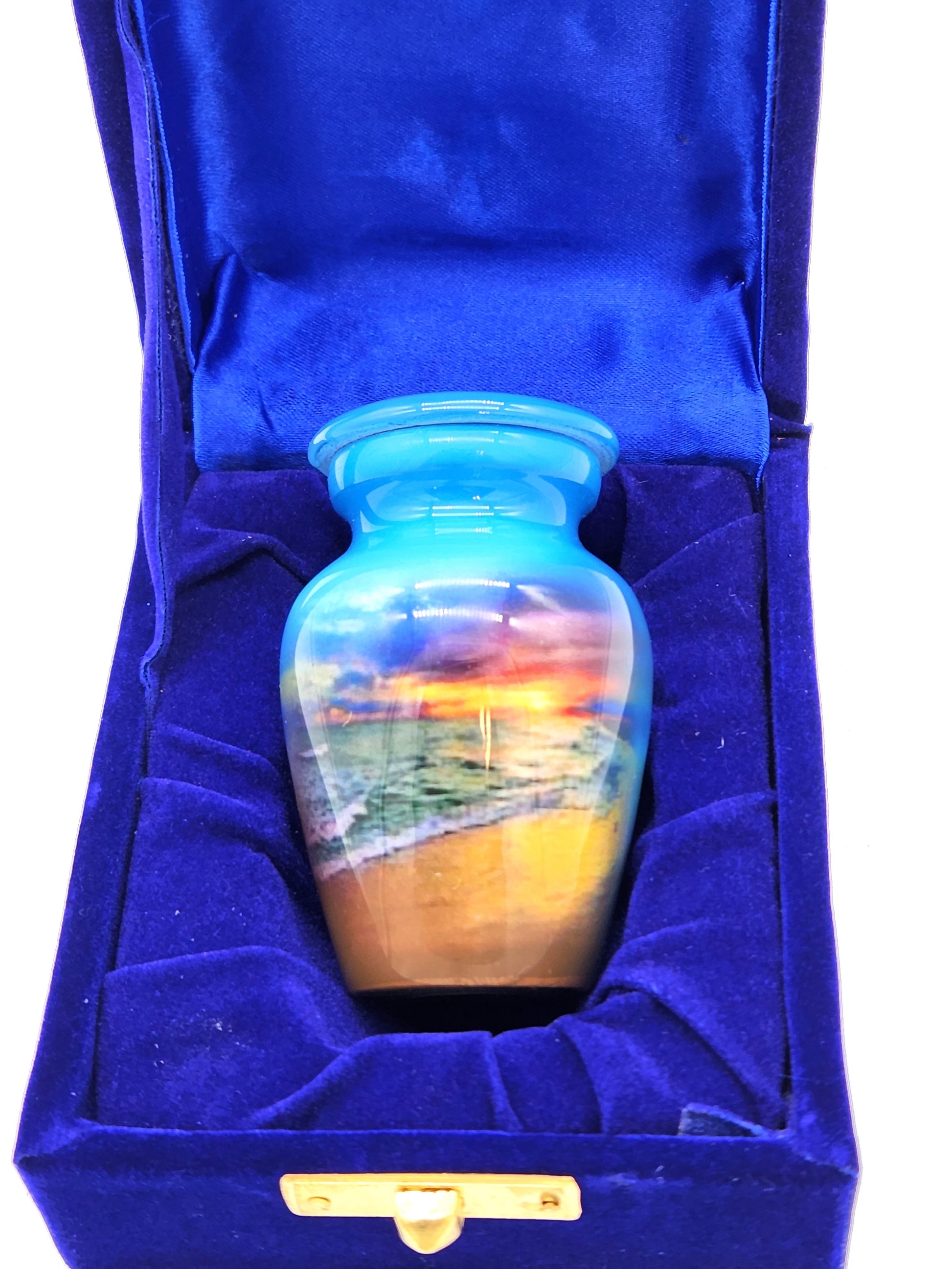 We offer this Keepsake urn with a beautiful beach at sunrise image. A fitting tribute to a loved one.